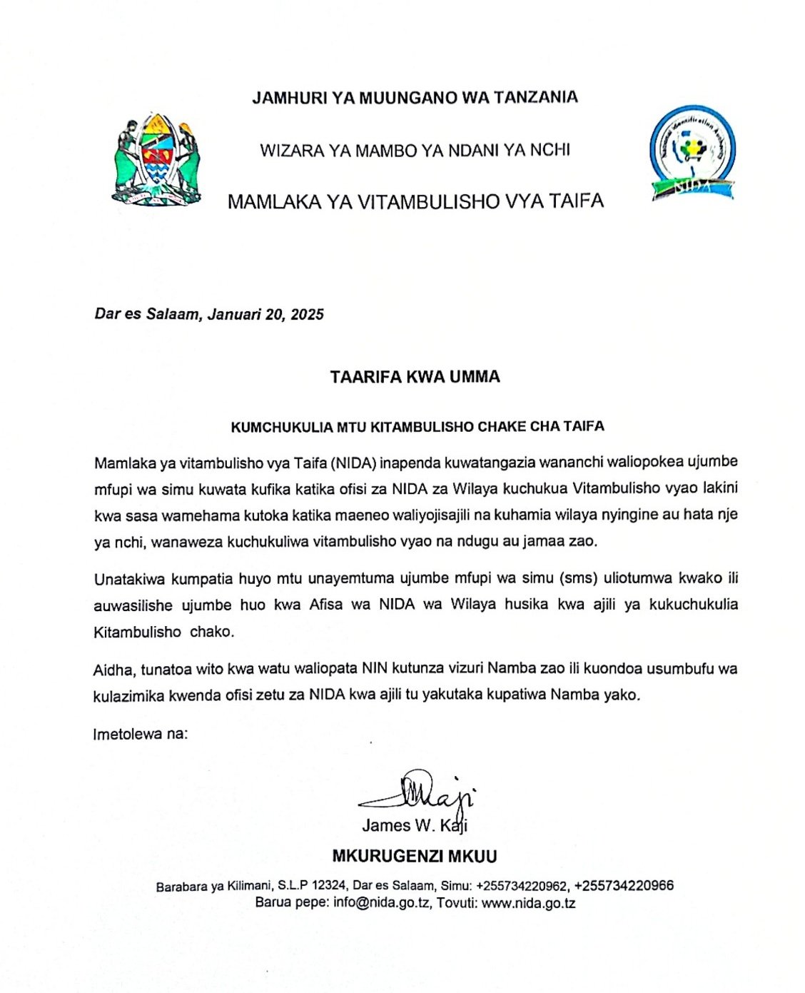 Mamlaka ya Vitambulisho vya Taifa (NIDA) imetoa utaratibu mpya wa kuwatumia ndugu na jamaa kuwachukulia vitambulisho vyao vya NIDA kwenye ofisi za serikali za mitaa.