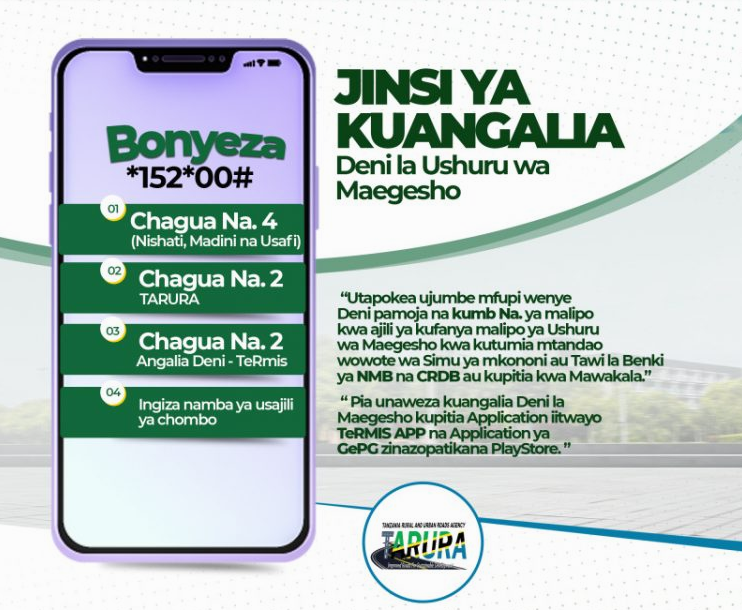 “Pia unaweza kuangalia Deni la Maegesho kupitia Application iitwayo TeRMIS APP na Application ya GePG zinazopatikana PlayStore.”