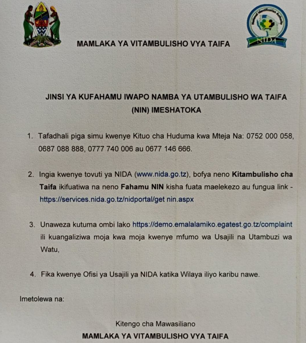 JINSI YA KUFAHAMU IWAPO NAMBA YA UTAMBULISHO WA TAIFA (NIN) IMESHATOKA