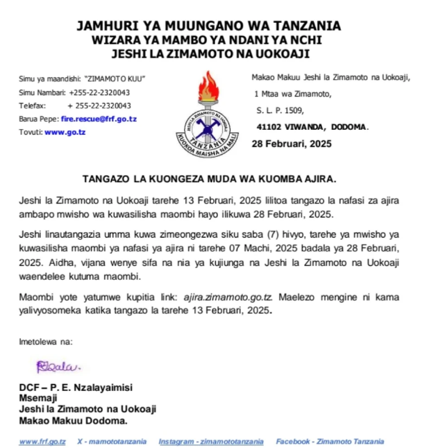 Maombi yote yatumwe kupitia link: ajira.zimamoto.go.tz. Maelezo mengine ni kama yalivyosomeka katika tangazo la tarehe 13 Februari, 2025.