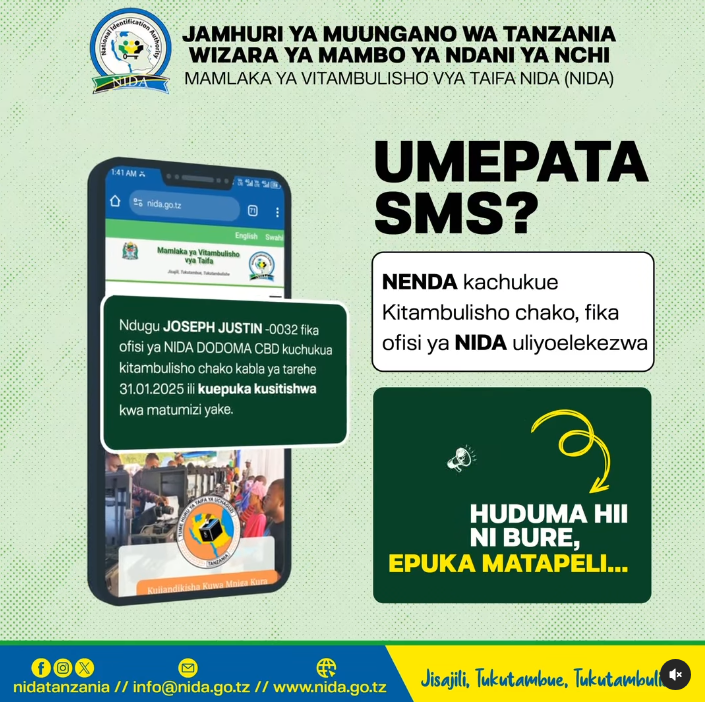 Ukipokea Ujumbe Mfupi wa simu (SMS) fika ofisi ya NIDA Wilaya uliko jisajili kuchukua Kitambulisho chako.
