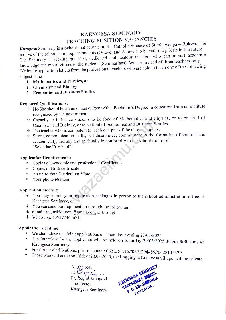 The Interview for the applicants will be held on Saturday 29/03/2025 From 8:30 am, at Kaengesa Seminary