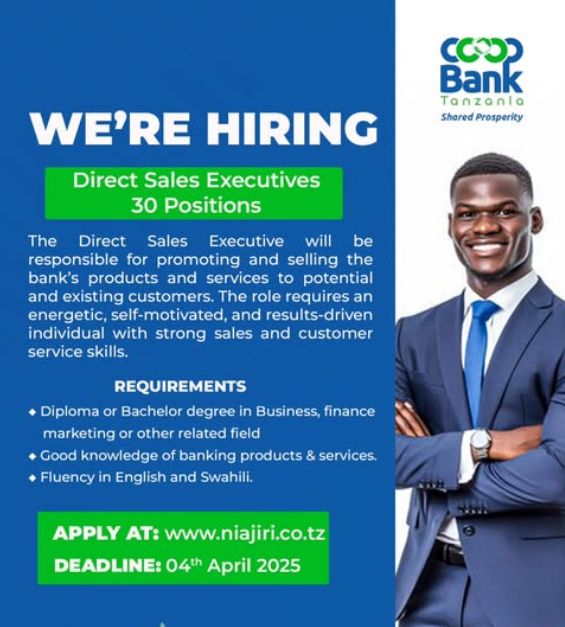 Nafasi 30 za Kazi Coop Bank Tanzania, March 2025 1 year agoby admin Jiunge Nasi WhatsApp Join WhatsApp Group Related posts: Nafasi za Kazi Shirika la Save the Children 2025 Nafasi 58 za Kazi ya Mkataba Wilaya ya Tanganyika 2025 Nafasi za Kazi Johari Rotana Hotel March 2025 Nafasi za Kazi International Organization for Migration (IOM) March 2025 Nafasi za Kazi SBA Communications March 2025 FacebookXWhatsApp