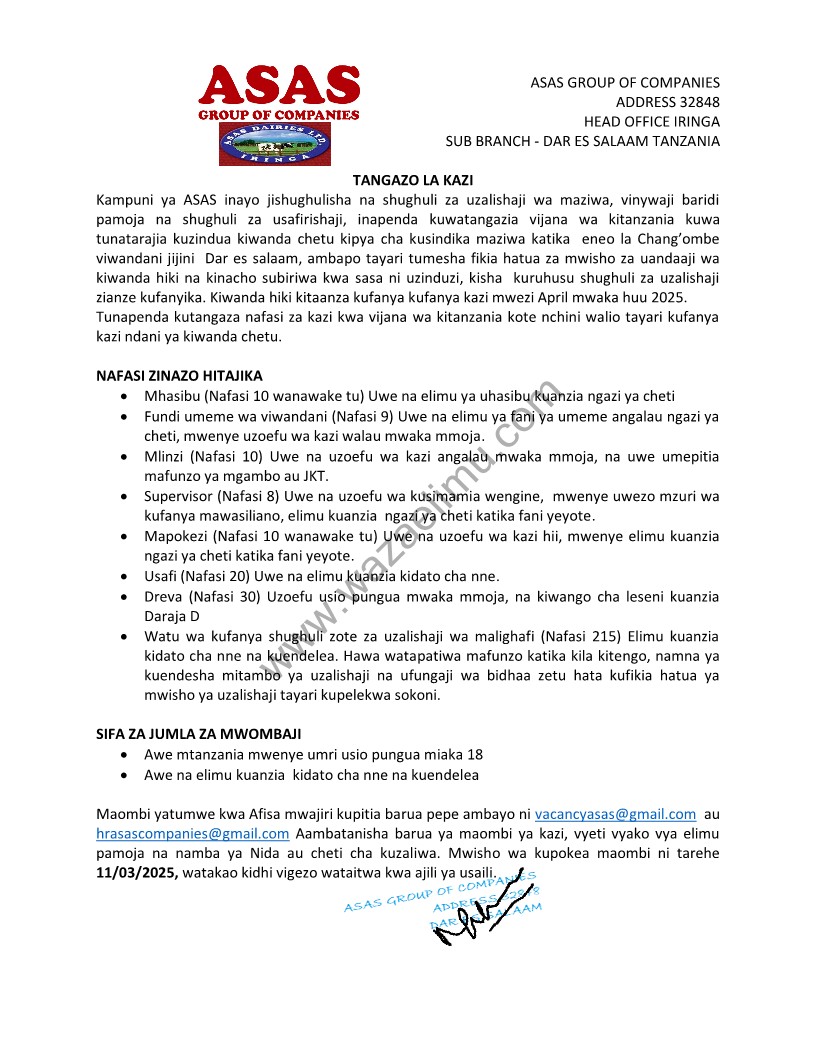 Maombi yatumwe kwa Afisa mwajiri kupitia barua pepe ambayo ni vacancyasas@gmail.com au hrasascompanies@gmail.com Aambatanisha barua ya maombi ya kazi, vyeti vyako vya elimu pamoja na namba ya Nida au cheti cha kuzaliwa. Mwisho wa kupokea maombi ni tarehe 11/03/2025, watakao kidhi vigezo wataitwa kwa ajili ya usaili.