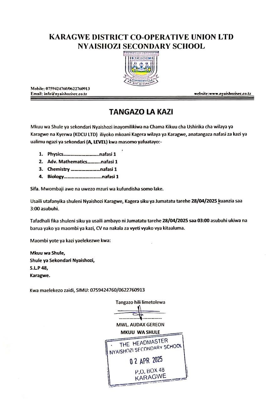 Mkuu wa Shule ya sekondari Nyaishozi inayomilikiwa na Chama Kikuu cha Ushirika cha wilaya ya Karagwe na Kyerwa (KDCU LTD) iliyoko mkoani Kagera wilaya ya Karagwe, anatangaza nafasi za kazi ya ualimu ngazi ya sekondari (A, LEVEL) kwa masomo yafuatayo :-