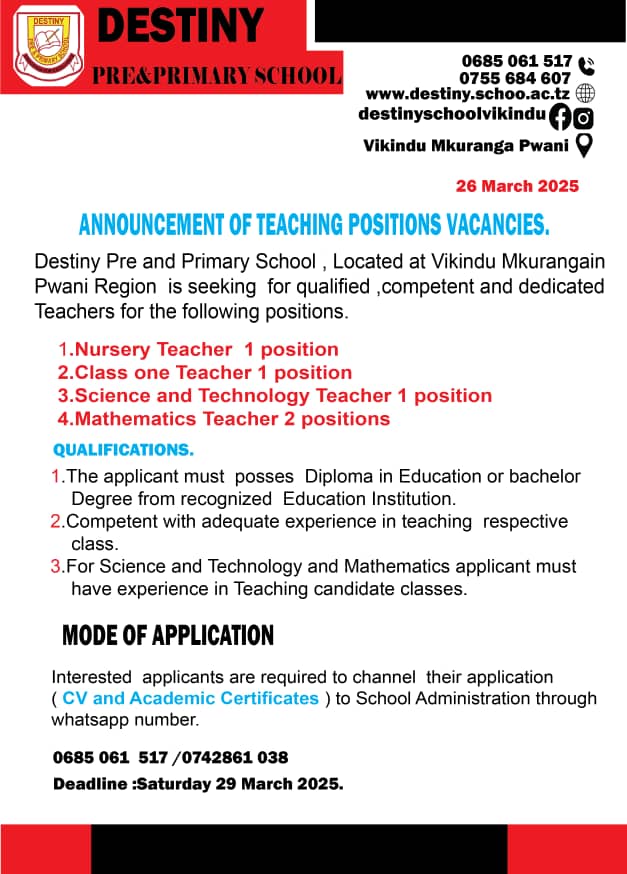 Notice: Function _load_textdomain_just_in_time was called incorrectly. Translation loading for the post-views-counter domain was triggered too early. This is usually an indicator for some code in the plugin or theme running too early. Translations should be loaded at the init action or later. Please see Debugging in WordPress for more information. (This message was added in version 6.7.0.) in /www/wwwroot/net.wazaelimu.com/wp-includes/functions.php on line 6131 Nafasi 5 za Ualimu Destiny Pre and Primary School 2025