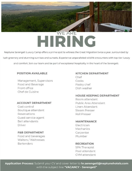 Nafasi 6 za Kazi Neptune Serengeti 2025 1 year agoby admin Jiunge Nasi WhatsApp Join WhatsApp Group Related posts: Majina Walioitwa Kwenye Mafunzo Uhamiaji 2025 Viwango vya Mishahara kwa Watumishi Serikali 2025/2026 Jinsi ya Kuandika Cover Letter 2025 – Format Zote Jinsi ya Kujibu Swali la “How much do you want us to pay you?” Documents Mhimu za Kuripoti Ukiwanazo Uhamiaji (Mafunzo) FacebookXWhatsApp
