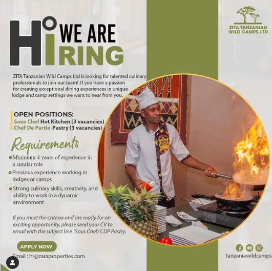 ZITA Tanzania Wild Camp Limited & Highview Hotel & Tours is the Tourist and Hospitality company dealing with Tour Agents and Accommodation. ZITA Tanzanian Wild Camps Ltd is looking for talented culinary/ professionals to join our team! .If you have a passion for creating exceptional dining experiences in unique lodge and camp settings we want to hear from you.