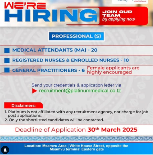 Send your credentials & application letter via recruitment@platinummedical.co.tz