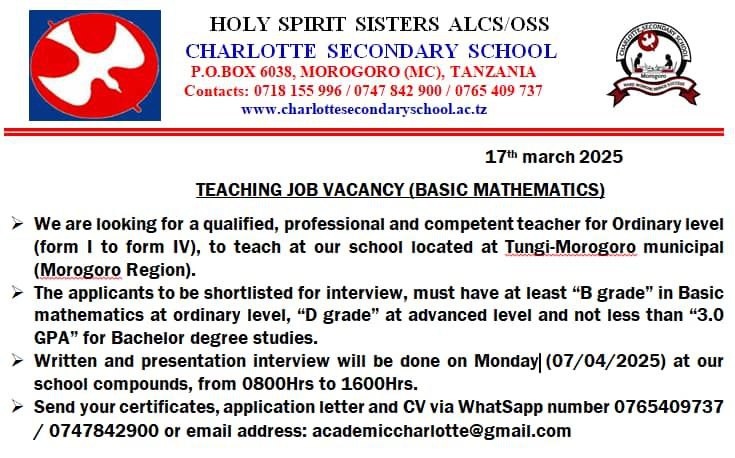 Nafasi za Kazi Ualimu Charlotte Secondary, March 2025