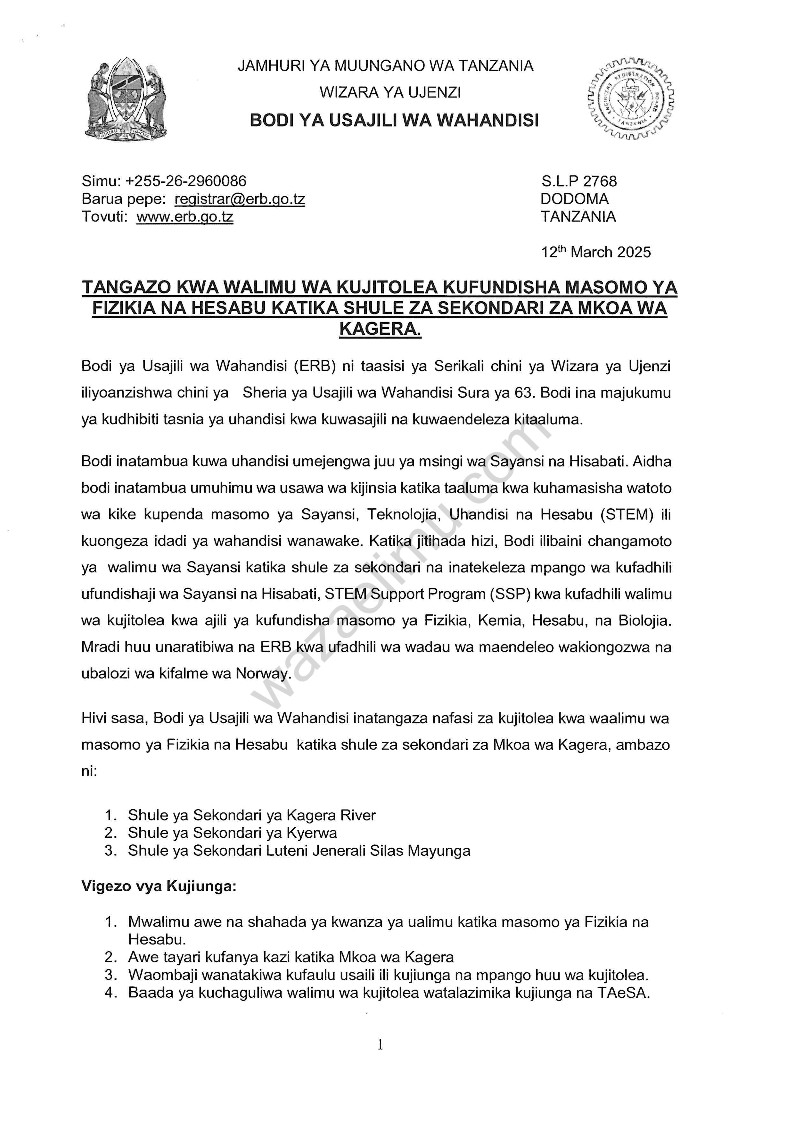 Nafasi za Kazi Ualimu Kujitolea Mkoa wa Kagera 2025
