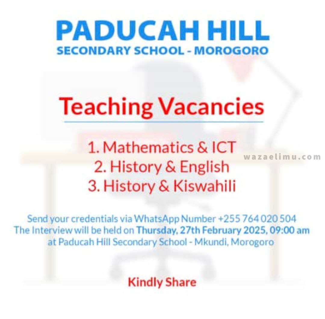 The Interview will be held on Thursday, 27th February 2025, 09:00 am at Paducah Hill Secondary School – Mkundi, Morogoro