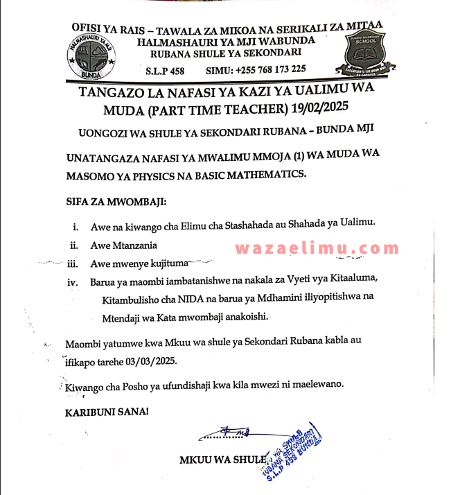 UONGOZI WA SHULE YA SEKONDARI RUBANA – BUNDA MJI UNATANGAZA NAFASI YA MWALIMU MMOJA (1) WA MUDA WA MASOMO YA PHYSICS NA BASIC MATHEMATICS.