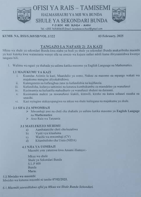 Mkuu wa shule ya sekondari Bunda kwa niaba ya bodi ya shule ya sekondari Bunda anakaribisha maombi