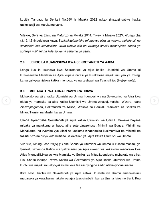 mbalimbali. Katika kuwezesha utekelezaji wa Sera hii, Kifungu cha 29 (1) cha Sheria ya Utumishi wa Umma, Sura ya 298, kinaelekeza kuwepo kwa chombo maalumu cha kushughulikia mchakato wa ajira katika Utumishi wa Umma. Kanuni za Uendeshaji wa Shughuli za Sekretarieti ya Ajira katika Utumishi wa Umma za Mwaka 2021 zilizotolewa