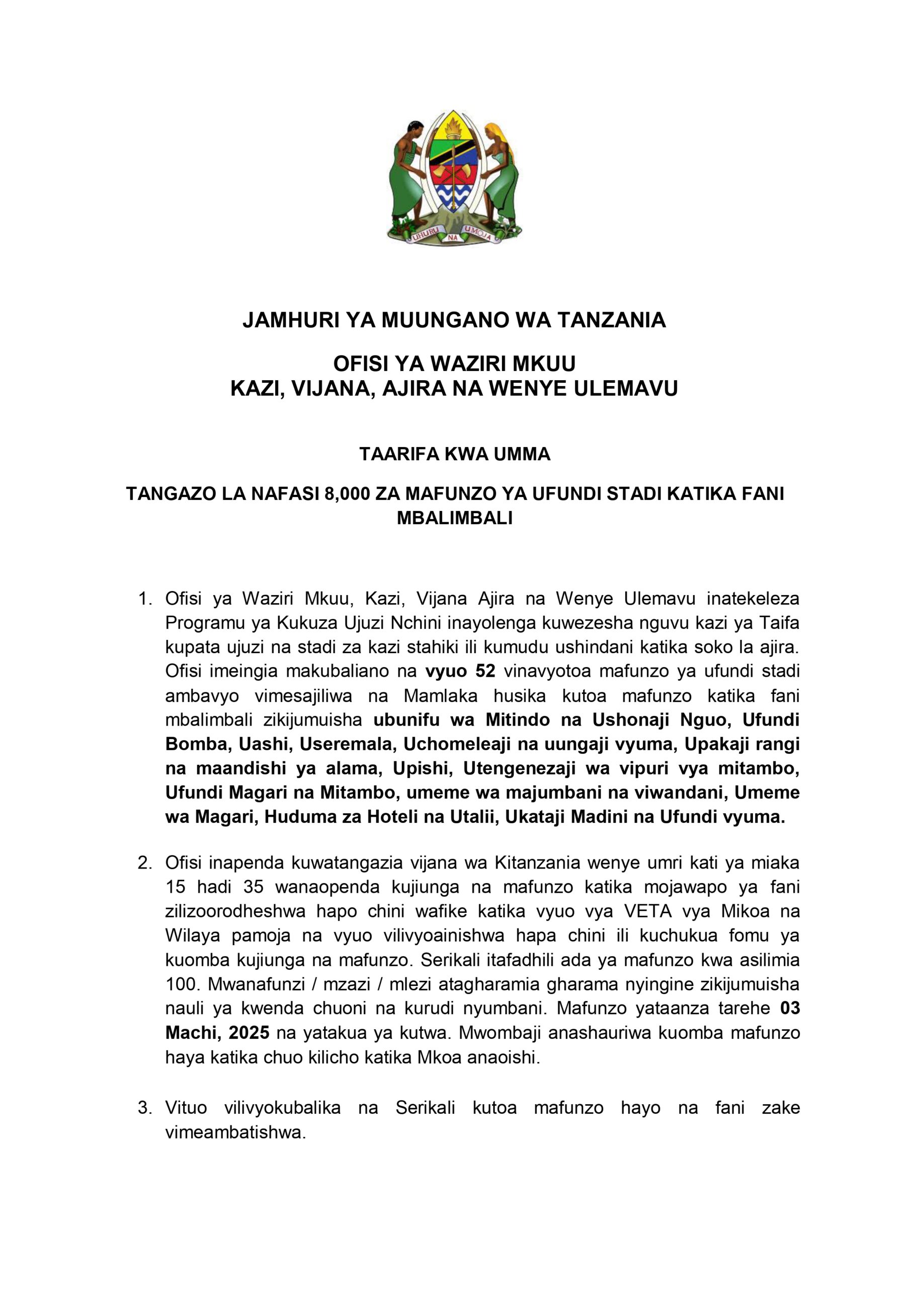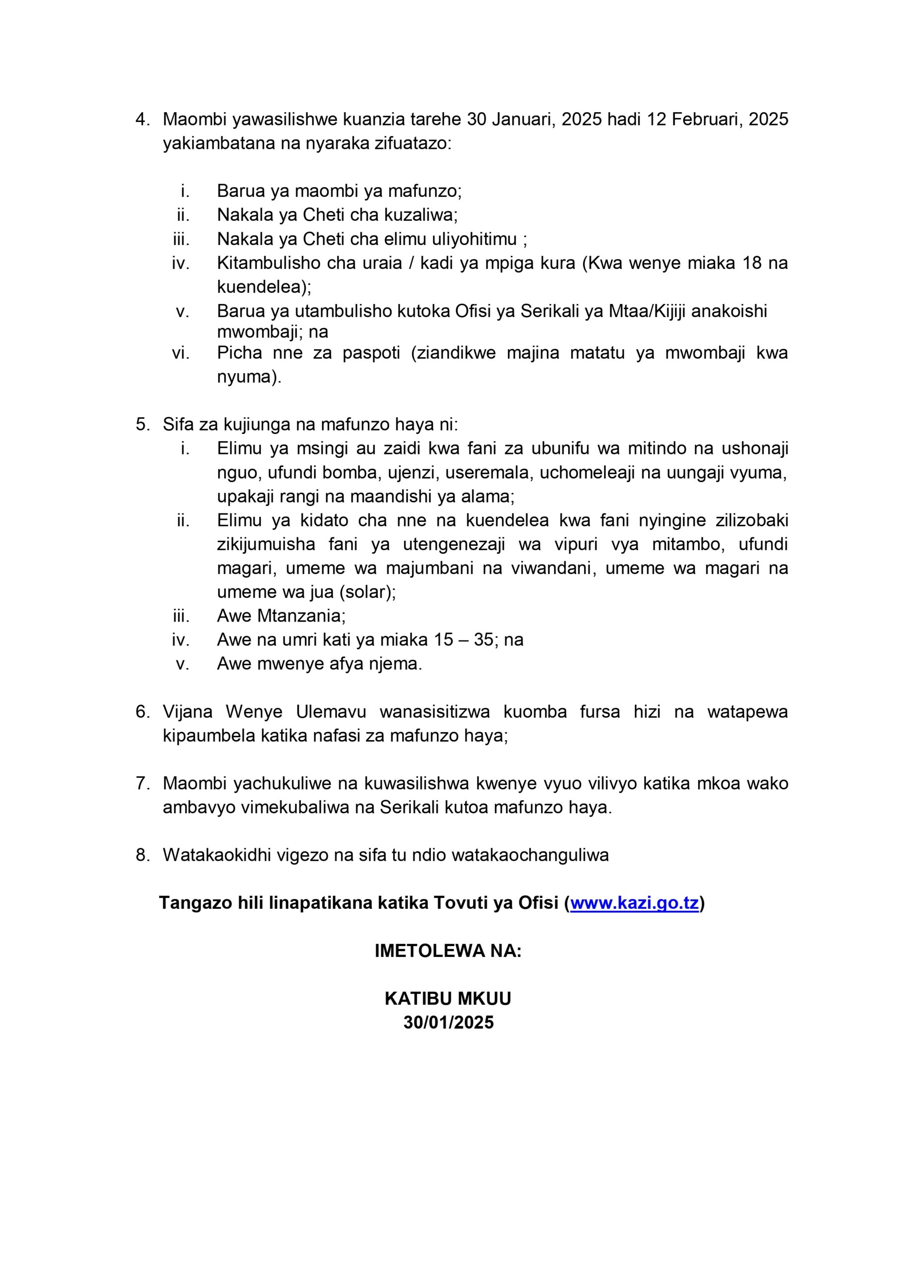 Ofisi inapenda kuwatangazia vijana wa Kitanzania wenye umri kati ya miaka 15 hadi 35 wanaopenda kujiunga na mafunzo katika mojawapo ya fani zilizoorodheshwa hapo chini wafike katika vyuo vya VETA vya Mikoa na Wilaya pamoja na vyuo vilivyoainishwa hapa chini ili kuchukua fomu ya kuomba kujiunga na mafunzo. Serikali itafadhili ada ya mafunzo kwa asilimia 100. Mwanafunzi / mzazi / mlezi atagharamia gharama nyingine zikijumuisha nauli ya kwenda chuoni na kurudi nyumbani. Mafunzo yataanza tarehe 03 Machi, 2025 na yatakua ya kutwa. Mwombaji anashauriwa kuomba mafunzo haya katika chuo kilicho katika Mkoa anaoishi.