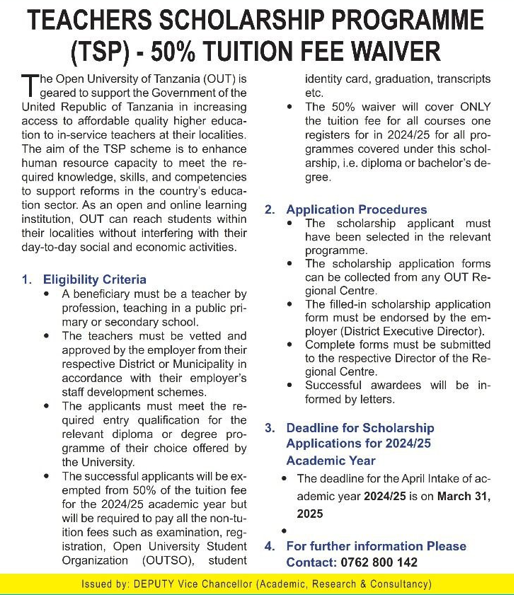 The successful applicants will be ex- empted from 50% of the tuition fee for the 2024/25 academic year but will be required to pay all the non-tu- ition fees such as examination, reg- istration, Open University Student Organization (OUTSO), student identity card, graduation, transcripts.