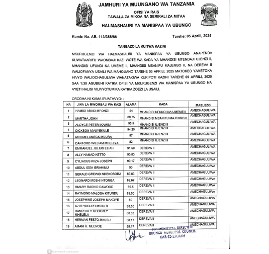 Walioitwa Kazini Manispaa ya Ubungo 2025 12 months agoby admin Jiunge Nasi WhatsApp Join WhatsApp Group Related posts: Jinsi ya Kujibu Swali la “What is your weakness?” Nafasi za Kazi St John’s University of Tanzania (SJUT) March 2025 Nafasi za Kazi Seacliff Resort and Spa March 2025 Nafasi Mpya za Kazi GGM March 2025 TANGAZO LA KUITWA KWENYE USAILI MDAs NA LGAs 02-04-2025 FacebookXWhatsApp